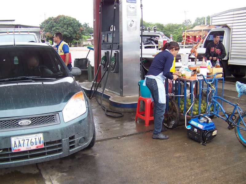 Nos paramos a colocarle GASOLINA al carro del yerno y me encuentro con esta joya de colección de las brutalidades humanas (???) en la estación de servicio de MIRI, esta una venta de raspados, jugo de naranja y además preparan la famosa bomba de vino Sansón y demás cosas.